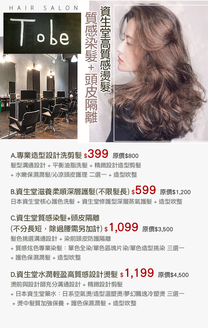 A.專業造型設計洗剪髮 / B.資生堂滋養柔順深層護髮(不限髮長) / C.資生堂質感染髮+頭皮隔離(不分長短,除過腰需另加計) / D.資生堂水潤輕盈高質感設計燙髮