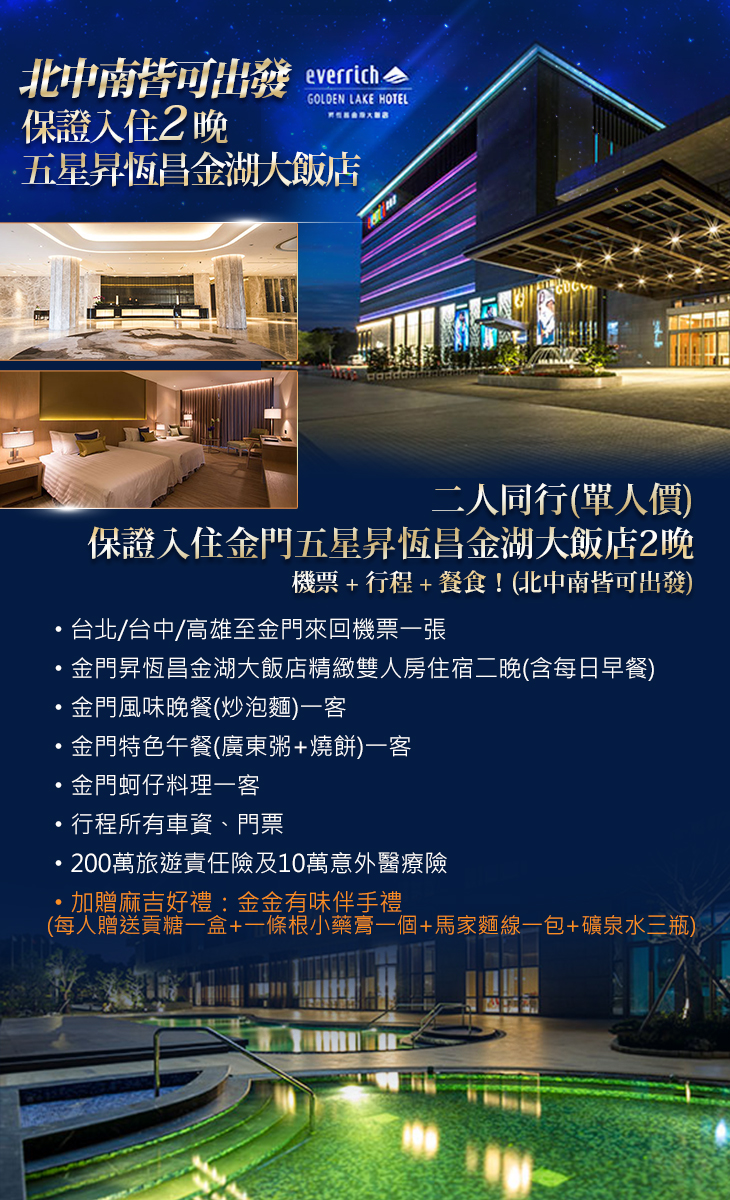 ★ 台北/台中/高雄皆可出發,機票+保證入住五星昇恆昌金湖大飯店2晚+行程+餐食,每人只要6500元起!