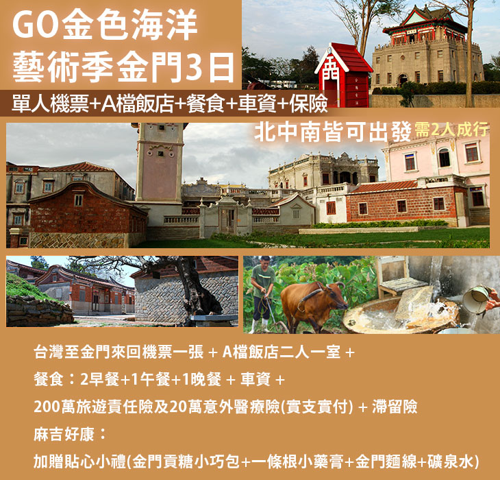 晨喚,享用飯店內早餐後,緊接著來到【民俗文化村】,充滿古趣的閩南式統聚落,共十八棟古厝燭列成群,為金門閩南建築之代表。【獅山砲陣地】所屬震東坑道開鑿在花崗岩岩層內..也就是在金門東部的獅山腹內..坑道全長508 公尺..平均高度4.6公尺..寬度3.6公尺.陣地設施完整。尤其是為活化軍事觀光資源,金門縣委托金門大學學生定期表演的炮操,學生扮演炮兵,操作8吋榴彈炮,成為最佳賣點。前往【一條根】,金門特有草本藥草,經研發後有多種產品,也是金門最佳伴手禮之一。【碧山洋樓】是金門島東邊的陳姓村莊之一,這裡有陳氏洋樓宗祠,也有一棟美麗的老洋樓。【碧山彩繪村】以縣定古蹟睿友國小為根據地,徵得周遭屋主的同意,以鮮艷色彩妝點牆面。【山外彩色屋】一整排彩色屋的特色建築就在山外橋兩側,舒服的陽光灑落,讓這排醒目的房屋更加亮眼,有金門小威尼斯之稱。【榕園】因早期村內有一顆巨石「鳳母石」,現今於金湖消防隊旁的岩壁則稱之為「鳳公石」,位居於「鳳穴」上的西洪村,在明朝時村中人才輩出,洪氏諸多族人在朝擔任要職,當時流傳著「人丁不滿百,京官三十六」的俗諺。【慰廬】在明朝時繁盛一時,當時的國學大師洪受故居即在此村,由蔣經國先生所命人重新修葺。【八二三戰史館】民國47年震驚中外的八二三砲戰,寫下中華民國歷史重要的一頁。參觀【昇恆昌免稅商店】讓您感受到不出國,一樣享有免稅購物。【高粱酒販賣中心】店內陳設各式各樣的高梁酒,品嚐地道的金門高梁酒,亦是金門有名的伴手禮之一。之後安排入宿飯店後,您可自行前往拜會親朋好友。