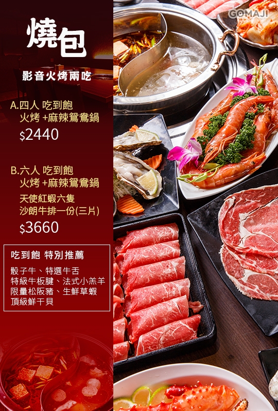 >>>六人火烤+麻辣鴛鴦鍋吃到飽+天使紅蝦六隻+沙朗牛排一份