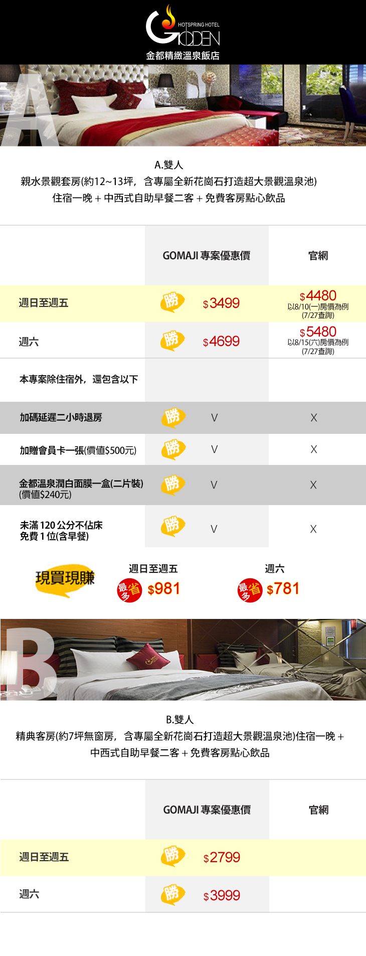★ 麻吉獨享:加碼延遲二小時退房、加贈會員卡一張(價值500元)、金都溫泉潤白面膜一盒(二片裝,價值240元)!