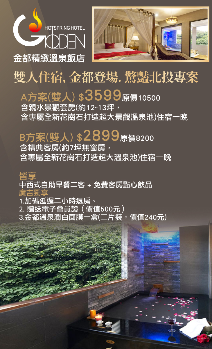 金都登場․驚豔北投,北投金都精緻溫泉飯店親水景觀套房系列,全新花崗石打造的超大景觀溫泉池都是設計在靠公園的位置,讓您擁有絕佳的視覺享受,獨立的廁所則設計在房間最裡面的位置,泡湯時不會看到馬桶,提升了泡湯的品質,具現代感及不同元素的豐富組合,處處讓人充滿驚喜。